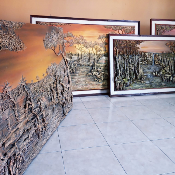Lukisan Relief Kayu Jati Erosi Rimbun Alam Pemukiman Lintang Seto Art